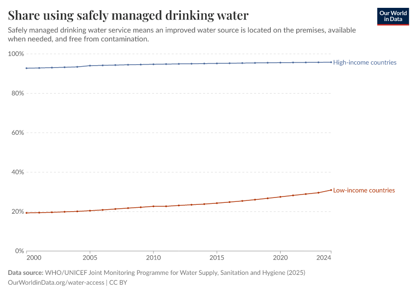 WHO/UNICEF Joint Monitoring Programme for Water Supply, Sanitation and Hygiene (2025) – processed by Our World in Data. “Share using safely managed drinking water” [dataset]. World Health Organization/UNICEF Joint Monitoring Programme for Water Supply, Sanitation and Hygiene, “WHO/UNICEF Joint Monitoring Programme for Water Supply, Sanitation and Hygiene (JMP) 2000-2024 report” [original data]. Retrieved February 27, 2026 from https://data-populationgrowth-discre.owid.pages.dev:8789/20260116-114957/grapher/proportion-using-safely-managed-drinking-water.html (archived on January 16, 2026).