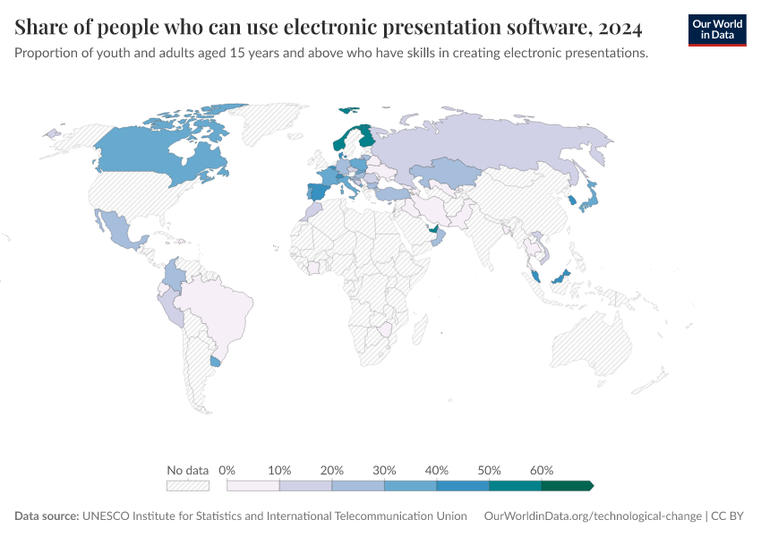 “Data Page: Share of people who can use electronic presentation software”. Our World in Data (2026). Data adapted from UNESCO Institute for Statistics and International Telecommunication Union. Retrieved from https://data-populationgrowth-discre.owid.pages.dev:8789/20251120-211038/grapher/proportion-with-ict-skills-in-presentations.html [online resource] (archived on November 20, 2025).How to cite this data