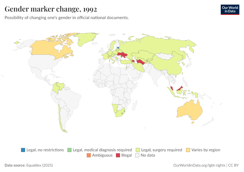 “Data Page: Gender marker change”, part of the following publication: Bastian Herre and Pablo Arriagada (2023) - “LGBT+ Rights”. Data adapted from Equaldex. Retrieved from https://data-populationgrowth-discre.owid.pages.dev:8789/20250909-093708/grapher/right-to-change-legal-gender-equaldex.html [online resource] (archived on September 9, 2025).How to cite this data