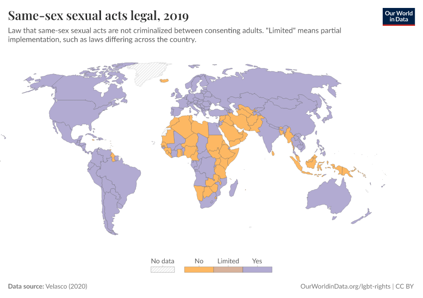“Data Page: Same-sex sexual acts legal”, part of the following publication: Bastian Herre and Pablo Arriagada (2023) - “LGBT+ Rights”. Data adapted from Velasco. Retrieved from https://data-populationgrowth-discre.owid.pages.dev:8789/20251023-195030/grapher/same-sex-sexual-acts-legal.html [online resource] (archived on October 23, 2025).How to cite this data