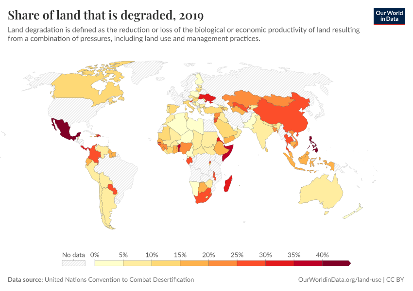 “Data Page: Share of land that is degraded”. Our World in Data (2026). Data adapted from United Nations Convention to Combat Desertification. Retrieved from https://data-populationgrowth-discre.owid.pages.dev:8789/20260130-180113/grapher/share-degraded-land.html [online resource] (archived on January 30, 2026).How to cite this data
