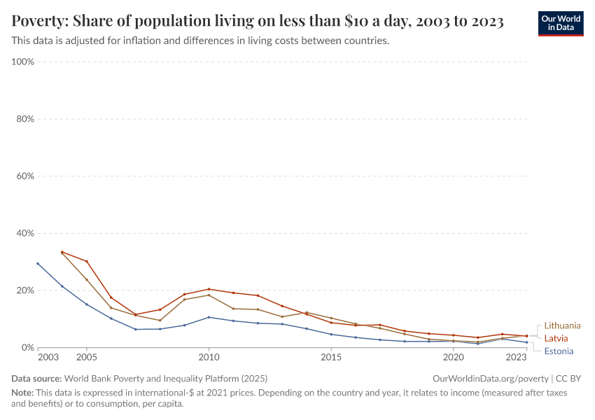 World Bank Poverty and Inequality Platform (2025) – with major processing by Our World in Data. “Poverty: Share of population living on less than $10 a day – World Bank” [dataset]. World Bank Poverty and Inequality Platform, “World Bank Poverty and Inequality Platform (PIP) 20250930_2021, 20250930_2017” [original data]. Retrieved February 27, 2026 from https://data-populationgrowth-discre.owid.pages.dev:8789/20260127-114142/grapher/share-living-with-less-than-10-int--per-day.html (archived on January 27, 2026).