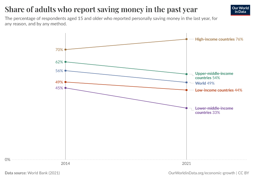 World Bank (2021) – with minor processing by Our World in Data. “Share of adults who report saving money in the past year” [dataset]. World Bank, “The Global Findex Database” [original data]. Retrieved February 27, 2026 from https://data-populationgrowth-discre.owid.pages.dev:8789/20250909-093708/grapher/share-of-adults-who-report-saving-money-in-the-past-year.html (archived on September 9, 2025).