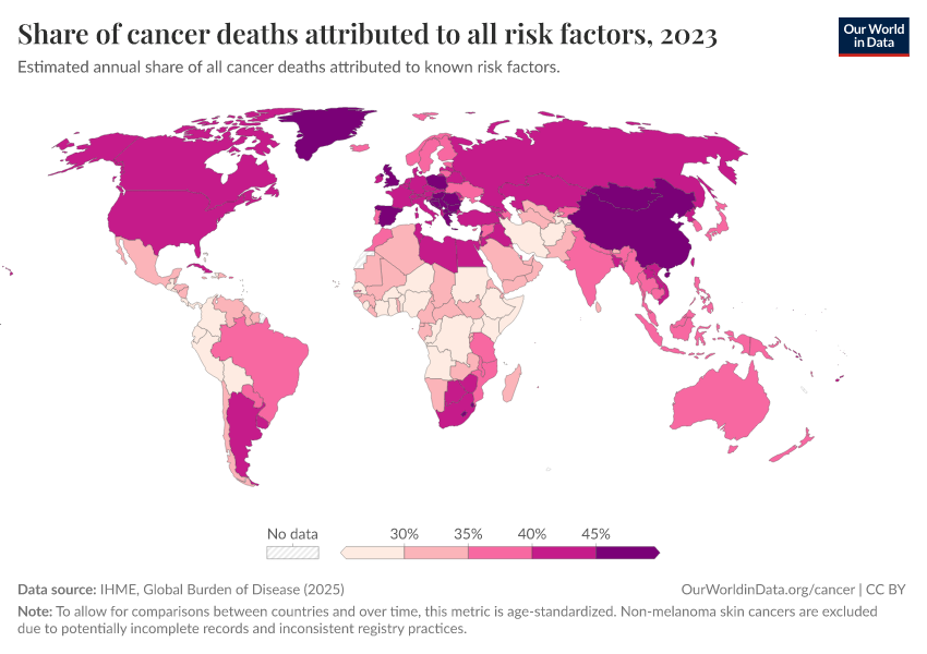 “Data Page: Share of cancer deaths attributed to all risk factors”, part of the following publication: Esteban Ortiz-Ospina and Max Roser (2016) - “Global Health”. Data adapted from IHME, Global Burden of Disease. Retrieved from https://data-populationgrowth-discre.owid.pages.dev:8789/20260213-144351/grapher/share-of-cancer-deaths-attributed-to-all-risk-factors.html [online resource] (archived on February 13, 2026).How to cite this data