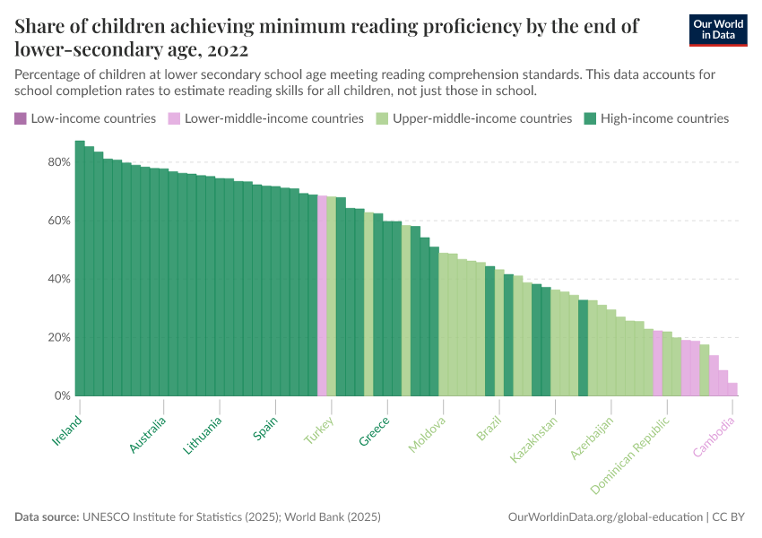 “Data Page: Share of children achieving minimum reading proficiency by the end of lower secondary age”, part of the following publication: Hannah Ritchie, Veronika Samborska, Esteban Ortiz-Ospina, and Max Roser (2023) - “Global Education”. Data adapted from UNESCO Institute for Statistics. Retrieved from https://data-populationgrowth-discre.owid.pages.dev:8789/20260122-091445/grapher/share-of-children-reaching-sufficient-reading-comprehension-by-the-end-of-lower-secondary-age.html [online resource] (archived on January 22, 2026).How to cite this data