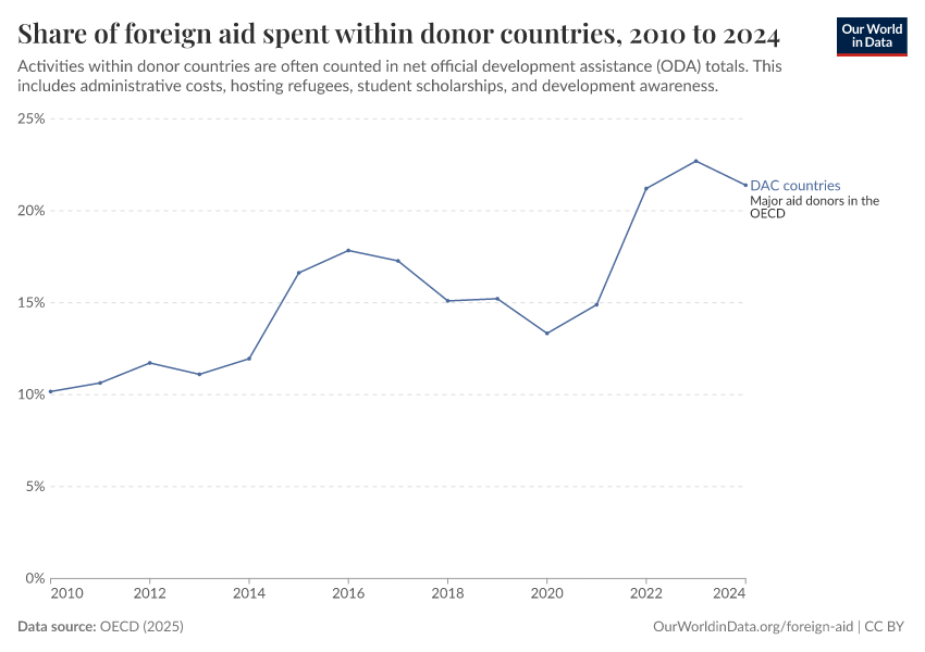 OECD (2025) – with minor processing by Our World in Data. “Share of foreign aid spent within donor countries – Net disbursements” [dataset]. OECD, “OECD Official Development Assistance (ODA) - DAC1: Flows by provider (ODA+OOF+Private)” [original data]. Retrieved February 27, 2026 from https://data-populationgrowth-discre.owid.pages.dev:8789/20251230-141326/grapher/share-of-foreign-aid-spent-within-donor-countries.html (archived on December 30, 2025).