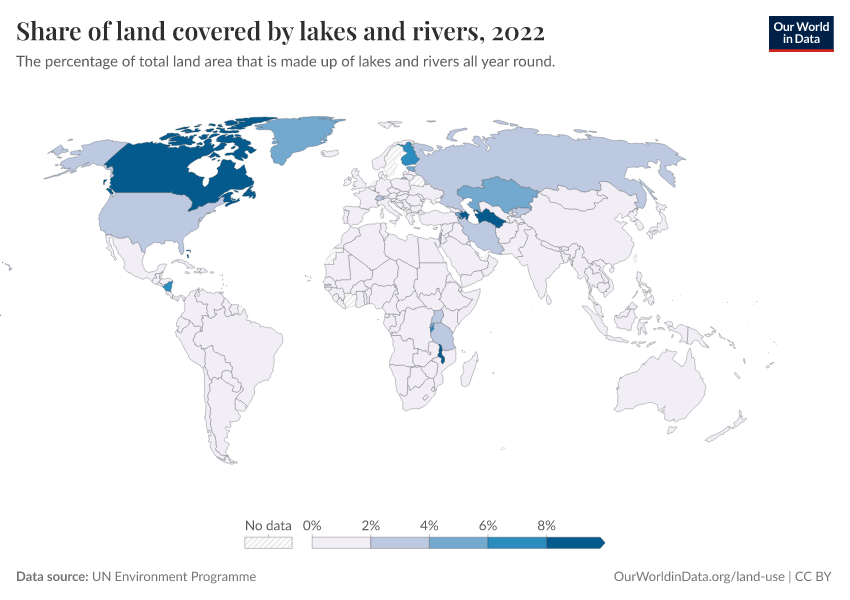 “Data Page: Share of land covered by lakes and rivers”. Our World in Data (2026). Data adapted from UN Environment Programme. Retrieved from https://data-populationgrowth-discre.owid.pages.dev:8789/20260130-180113/grapher/share-of-land-covered-by-lakes-and-rivers.html [online resource] (archived on January 30, 2026).How to cite this data