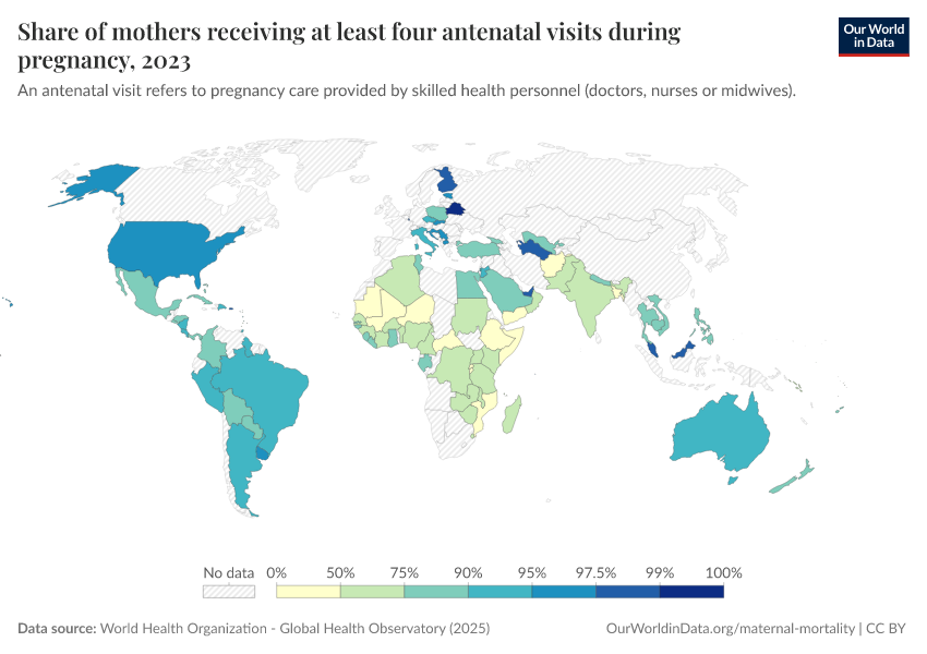 World Health Organization - Global Health Observatory (2025) – processed by Our World in Data. “Share of mothers receiving at least four antenatal visits during pregnancy” [dataset]. World Health Organization, “Global Health Observatory” [original data]. Retrieved February 27, 2026 from https://data-populationgrowth-discre.owid.pages.dev:8789/20250909-093708/grapher/share-of-mothers-receiving-at-least-four-antenatal-visits-during-pregnancy.html (archived on September 9, 2025).