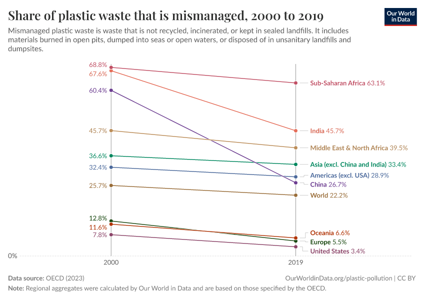 “Data Page: Share of plastic waste that is mismanaged”, part of the following publication: Hannah Ritchie, Veronika Samborska, and Max Roser (2023) - “Plastic Pollution”. Data adapted from OECD. Retrieved from https://data-populationgrowth-discre.owid.pages.dev:8789/20250909-093708/grapher/share-of-plastic-waste-that-is-mismanaged.html [online resource] (archived on September 9, 2025).How to cite this data