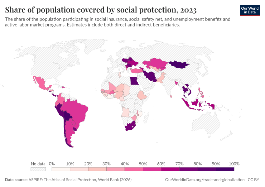 “Data Page: Share of population covered by social protection”. Our World in Data (2026). Data adapted from ASPIRE: The Atlas of Social Protection, World Bank. Retrieved from https://data-populationgrowth-discre.owid.pages.dev:8789/20260202-181317/grapher/share-of-population-covered-by-social-protection.html [online resource] (archived on February 2, 2026).How to cite this data