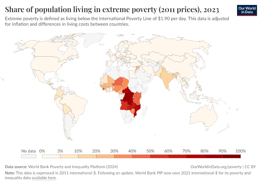 World Bank Poverty and Inequality Platform (2024) – with major processing by Our World in Data. “Share of population living in extreme poverty (2011 prices) – World Bank” [dataset]. World Bank Poverty and Inequality Platform, “World Bank Poverty and Inequality Platform (PIP) 20240627_2017, 20240627_2011” [original data]. Retrieved February 27, 2026 from https://data-populationgrowth-discre.owid.pages.dev:8789/20251022-091218/grapher/share-of-population-in-extreme-poverty-2011-ppp.html (archived on October 22, 2025).