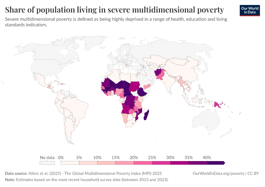 “Data Page: Share of population living in severe multidimensional poverty”, part of the following publication: Joe Hasell, Bertha Rohenkohl, Pablo Arriagada, Esteban Ortiz-Ospina, and Max Roser (2022) - “Poverty”. Data adapted from Alkire et al.. Retrieved from https://data-populationgrowth-discre.owid.pages.dev:8789/20251229-175603/grapher/share-of-population-in-severe-multidimensional-poverty.html [online resource] (archived on December 29, 2025).How to cite this data