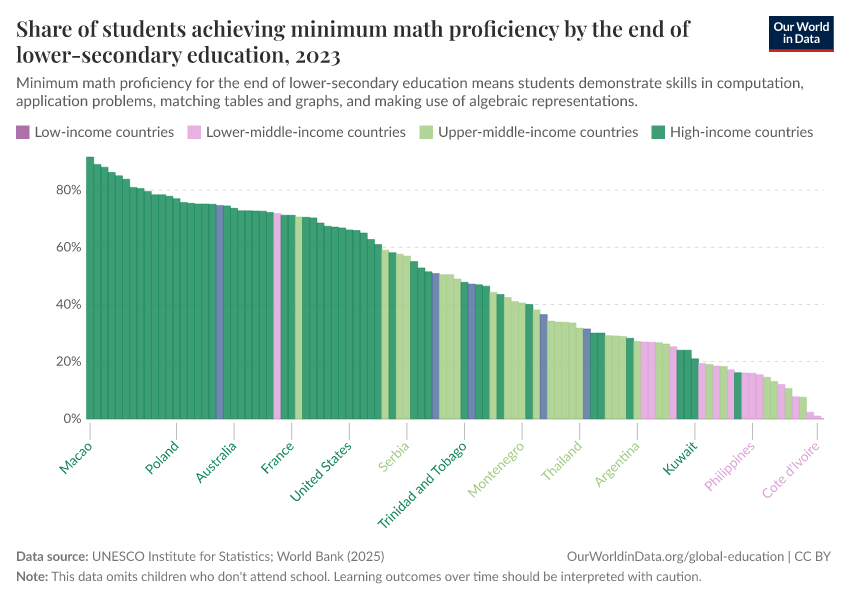 “Data Page: Share of students achieving minimum math proficiency by the end of lower-secondary education”. Our World in Data (2026). Data adapted from UNESCO Institute for Statistics. Retrieved from https://data-populationgrowth-discre.owid.pages.dev:8789/20260130-180113/grapher/share-of-students-at-end-of-lower-secondary-education-achieving-minimum-math-proficiency.html [online resource] (archived on January 30, 2026).How to cite this data
