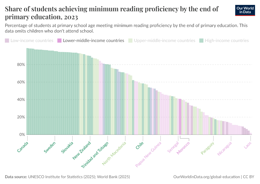 “Data Page: Share of students achieving minimum reading proficiency by the end of primary education”, part of the following publication: Hannah Ritchie, Veronika Samborska, Esteban Ortiz-Ospina, and Max Roser (2023) - “Global Education”. Data adapted from UNESCO Institute for Statistics. Retrieved from https://data-populationgrowth-discre.owid.pages.dev:8789/20260122-091445/grapher/share-of-students-at-end-of-primary-education-achieving-minimum-reading-proficiency.html [online resource] (archived on January 22, 2026).How to cite this data