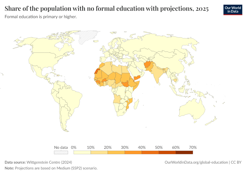 “Data Page: Share of the population with no formal education with projections”, part of the following publication: Hannah Ritchie, Veronika Samborska, Esteban Ortiz-Ospina, and Max Roser (2023) - “Global Education”. Data adapted from Wittgenstein Centre. Retrieved from https://data-populationgrowth-discre.owid.pages.dev:8789/20260212-032504/grapher/share-of-the-population-with-no-formal-education-with-projections.html [online resource] (archived on February 12, 2026).How to cite this data