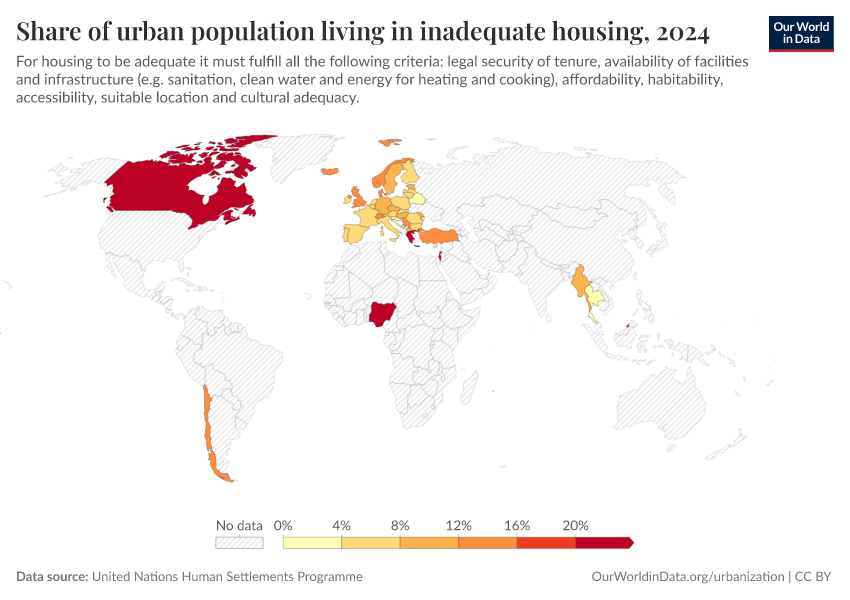 “Data Page: Share of urban population living in inadequate housing”. Our World in Data (2026). Data adapted from United Nations Human Settlements Programme. Retrieved from https://data-populationgrowth-discre.owid.pages.dev:8789/20251120-211749/grapher/share-of-urban-population-living-in-inadequate-housing.html [online resource] (archived on November 20, 2025).How to cite this data