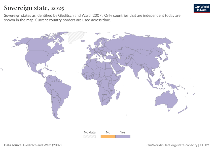 “Data Page: Sovereign state”, part of the following publication: Bastian Herre and Pablo Arriagada (2023) - “State Capacity”. Data adapted from Gleditsch and Ward. Retrieved from https://data-populationgrowth-discre.owid.pages.dev:8789/20260119-070102/grapher/sovereign-state-gleditsch-ward.html [online resource] (archived on January 19, 2026).How to cite this data