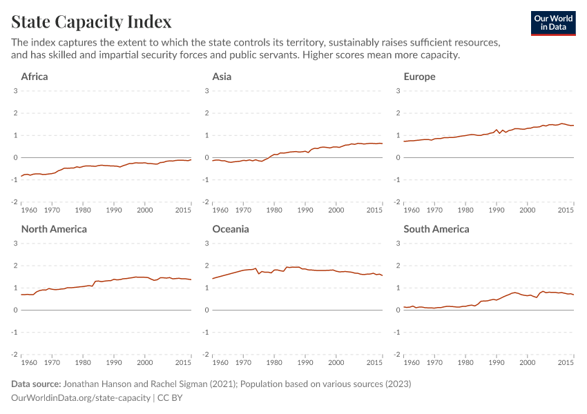 “Data Page: State Capacity Index”, part of the following publication: Bastian Herre and Pablo Arriagada (2023) - “State Capacity”. Data adapted from Jonathan Hanson and Rachel Sigman, Various sources. Retrieved from https://data-populationgrowth-discre.owid.pages.dev:8789/20260223-071105/grapher/state-capacity-index.html [online resource] (archived on February 23, 2026).How to cite this data