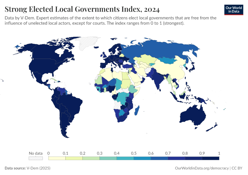 “Data Page: Elected local governments”, part of the following publication: Bastian Herre, Lucas Rodés-Guirao, and Esteban Ortiz-Ospina (2013) - “Democracy”. Data adapted from V-Dem. Retrieved from https://data-populationgrowth-discre.owid.pages.dev:8789/20260119-070102/grapher/strong-elected-local-governments-index.html [online resource] (archived on January 19, 2026).How to cite this data