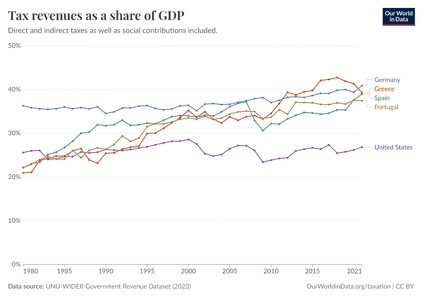 UNU-WIDER Government Revenue Dataset (2023) – with major processing by Our World in Data. “Tax revenues as a share of GDP – UNU-WIDER” [dataset]. UNU-WIDER, “Government Revenue Dataset (GRD) 2023” [original data]. Retrieved February 27, 2026 from https://data-populationgrowth-discre.owid.pages.dev:8789/20260105-133053/grapher/tax-revenues-as-a-share-of-gdp-unu-wider.html (archived on January 5, 2026).