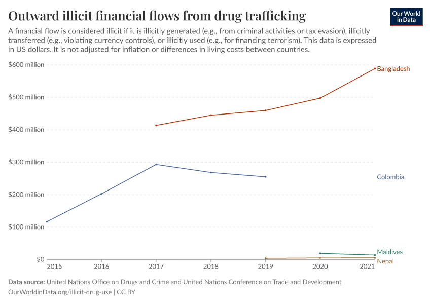 “Data Page: Outward illicit financial flows from drug trafficking”. Our World in Data (2026). Data adapted from United Nations Office on Drugs and Crime and United Nations Conference on Trade and Development. Retrieved from https://data-populationgrowth-discre.owid.pages.dev:8789/20251120-211749/grapher/total-outward-financial-flows-from-drug-trafficking.html [online resource] (archived on November 20, 2025).How to cite this data