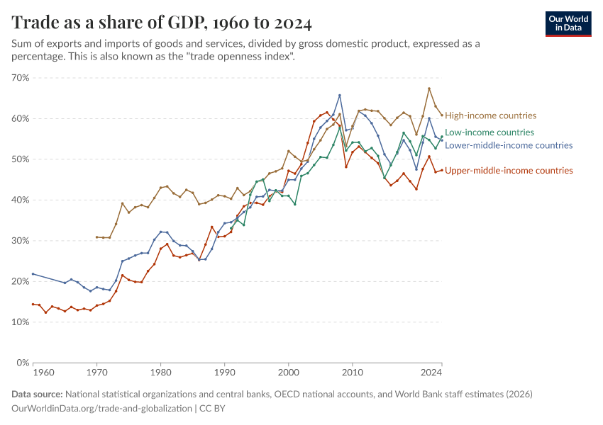 “Data Page: Trade as a share of GDP”, part of the following publication: Esteban Ortiz-Ospina, Bertha Rohenkohl, Veronika Samborska, Simon Van Teutem, Diana Beltekian, and Max Roser (2018) - “Trade and Globalization”. Data adapted from National statistical organizations and central banks, OECD national accounts, and World Bank staff estimates. Retrieved from https://data-populationgrowth-discre.owid.pages.dev:8789/20260225-205642/grapher/trade-as-share-of-gdp.html [online resource] (archived on February 25, 2026).How to cite this data