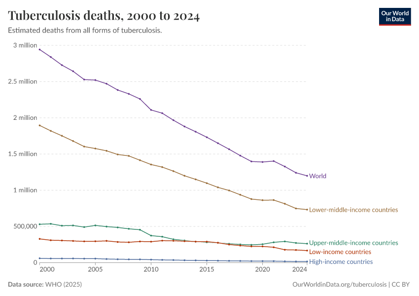 WHO (2025) – with minor processing by Our World in Data. “Tuberculosis deaths” [dataset]. WHO, “Global Tuberculosis Report - Burden Estimates” [original data]. Retrieved February 27, 2026 from https://data-populationgrowth-discre.owid.pages.dev:8789/20260205-170810/grapher/tuberculosis-deaths-who.html (archived on February 5, 2026).