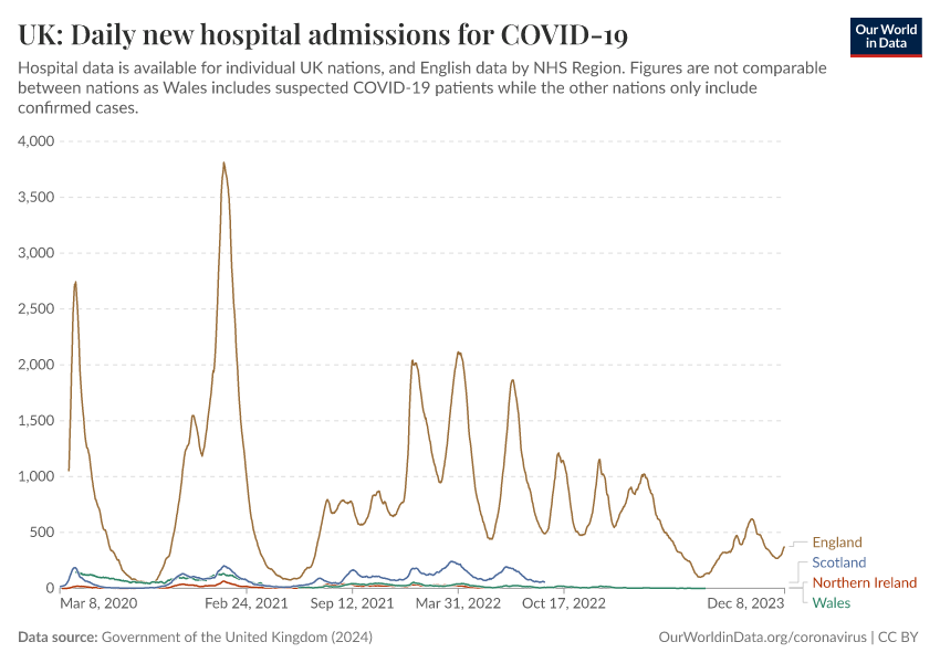 Government of the United Kingdom (2024) – with minor processing by Our World in Data. “UK: Daily new hospital admissions for COVID-19” [dataset]. Government of the United Kingdom, “UKHSA data dashboard” [original data]. Retrieved February 27, 2026 from https://data-populationgrowth-discre.owid.pages.dev:8789/20250909-093708/grapher/uk-daily-covid-admissions.html (archived on September 9, 2025).