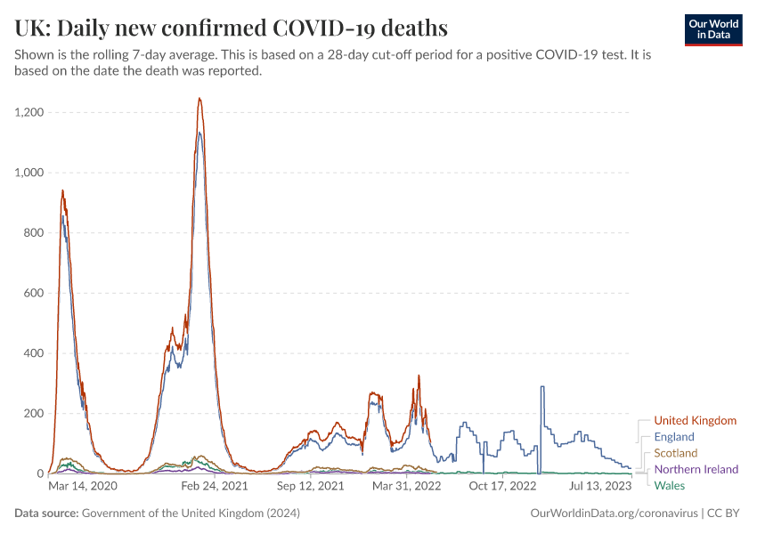 Government of the United Kingdom (2024) – with minor processing by Our World in Data. “UK: Daily new confirmed COVID-19 deaths” [dataset]. Government of the United Kingdom, “UKHSA data dashboard” [original data]. Retrieved February 27, 2026 from https://data-populationgrowth-discre.owid.pages.dev:8789/20250909-093708/grapher/uk-daily-covid-deaths.html (archived on September 9, 2025).