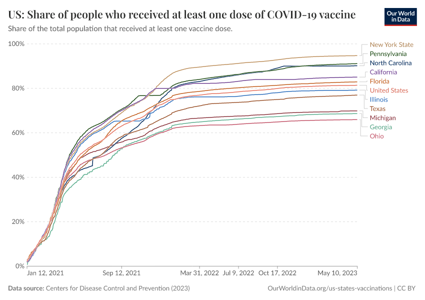 Centers for Disease Control and Prevention (2023) – processed by Our World in Data. “US: Share of people who received at least one dose of COVID-19 vaccine” [dataset]. Centers for Disease Control and Prevention, “COVID-19, Vaccinations (United States)” [original data]. Retrieved February 27, 2026 from https://data-populationgrowth-discre.owid.pages.dev:8789/20250909-093708/grapher/us-covid-19-share-people-vaccinated.html (archived on September 9, 2025).
