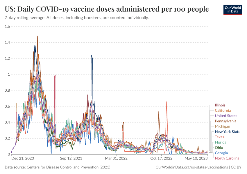 Centers for Disease Control and Prevention (2023) – processed by Our World in Data. “US: Daily COVID-19 vaccine doses administered per 100 people” [dataset]. Centers for Disease Control and Prevention, “COVID-19, Vaccinations (United States)” [original data]. Retrieved February 27, 2026 from https://data-populationgrowth-discre.owid.pages.dev:8789/20250909-093708/grapher/us-daily-covid-vaccine-doses-per-100.html (archived on September 9, 2025).