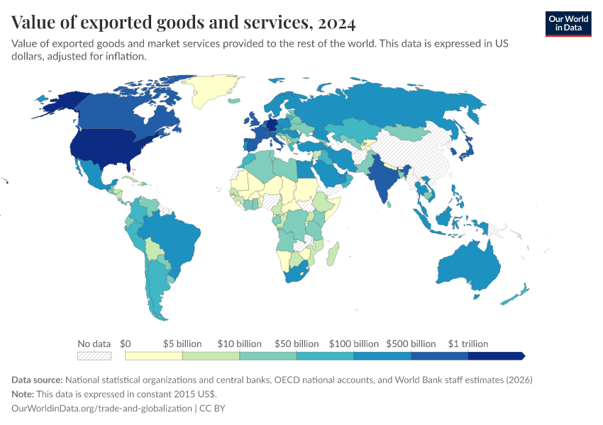“Data Page: Value of exported goods and services”. Our World in Data (2026). Data adapted from National statistical organizations and central banks, OECD national accounts, and World Bank staff estimates. Retrieved from https://data-populationgrowth-discre.owid.pages.dev:8789/20260202-181317/grapher/value-of-exported-goods-and-services.html [online resource] (archived on February 2, 2026).How to cite this data