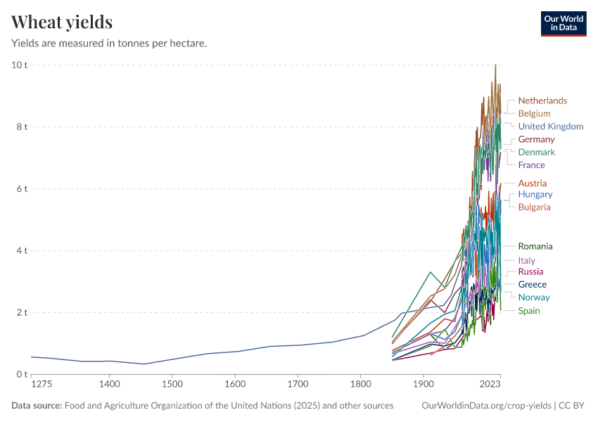 Food and Agriculture Organization of the United Nations (2025); Broadberry et al. (2015); Brassley (2000); Bayliss-Smith & Wanmali (1984) – with major processing by Our World in Data. “Wheat yields” [dataset]. Food and Agriculture Organization of the United Nations, “Production: Crops and livestock products”; Broadberry et al., “Long-term crop yields in UK”; Brassley, “Long-term crop yields in UK”; Bayliss-Smith & Wanmali, “Understanding Green Revolutions” [original data]. Retrieved February 27, 2026 from https://data-populationgrowth-discre.owid.pages.dev:8789/20260116-143329/grapher/wheat-yields.html (archived on January 16, 2026).