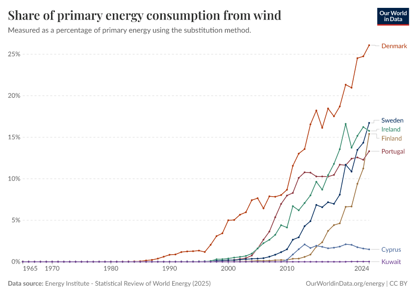 Energy Institute - Statistical Review of World Energy (2025) – with major processing by Our World in Data. “Share of primary energy consumption that comes from wind power – Using the substitution method” [dataset]. Energy Institute, “Statistical Review of World Energy” [original data]. Retrieved February 27, 2026 from https://data-populationgrowth-discre.owid.pages.dev:8789/20260119-070102/grapher/wind-share-energy.html (archived on January 19, 2026).