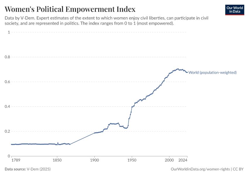 “Data Page: Women's political empowerment index”, part of the following publication: Bastian Herre, Lucas Rodés-Guirao, and Esteban Ortiz-Ospina (2013) - “Democracy”. Data adapted from V-Dem. Retrieved from https://data-populationgrowth-discre.owid.pages.dev:8789/20260119-070102/grapher/women-political-empowerment-index.html [online resource] (archived on January 19, 2026).How to cite this data
