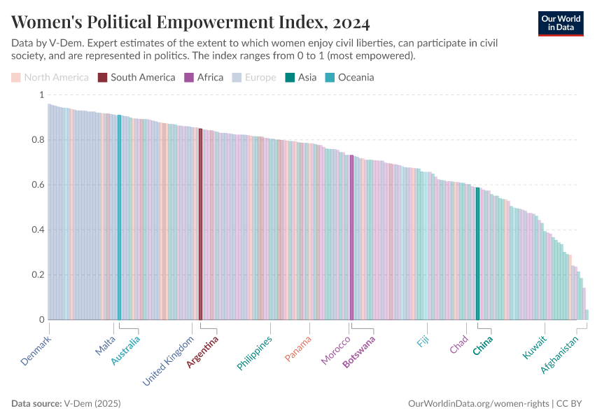 V-Dem (2025) – processed by Our World in Data. “Women's political empowerment index – V-Dem” [dataset]. V-Dem, “Democracy report v15” [original data]. Retrieved February 27, 2026 from https://data-populationgrowth-discre.owid.pages.dev:8789/20260119-070102/grapher/women-political-empowerment-index.html (archived on January 19, 2026).