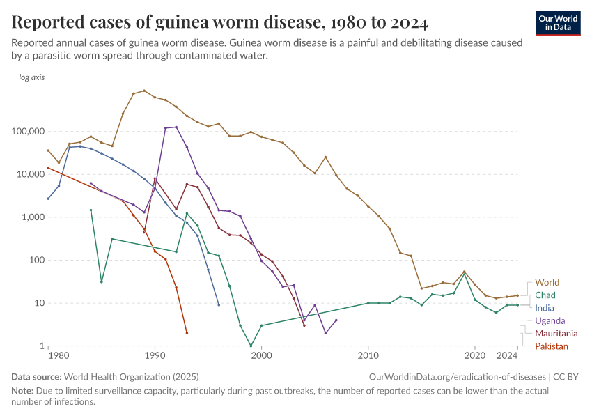 Saloni Dattani and Fiona Spooner (2022) - “Guinea worm disease is close to being eradicated – how was this progress achieved?” Published online at OurWorldinData.org. Retrieved from: 'https://data-populationgrowth-discre.owid.pages.dev:8789/20251125-173858/guinea-worm-path-eradication.html' [Online Resource] (archived on November 25, 2025).BibTeX citation
