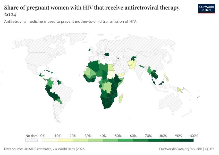 This map shows the share of pregnant women infected with HIV who receive antiretroviral therapy – a vital intervention to prevent the transmission from mother to child.