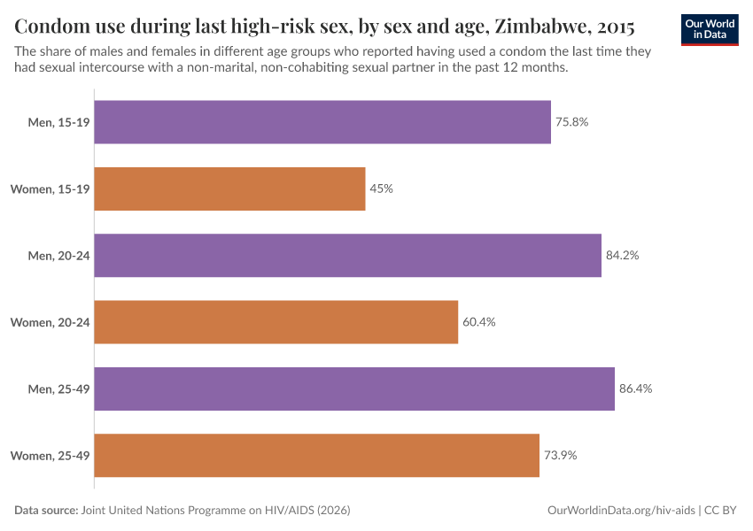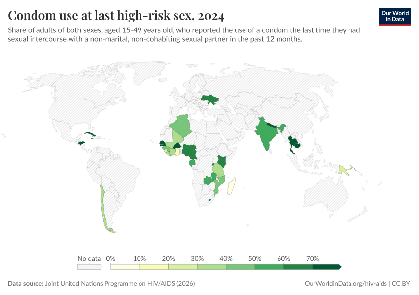 Sexual transmission can be prevented through condom use (both in heterosexual and homosexual relationships). In the charts here, we see the prevalence of condom use, particularly in cases of “high-risk sex”, which is defined by this data’s source as non-marital, non-cohabiting sexual partner.
