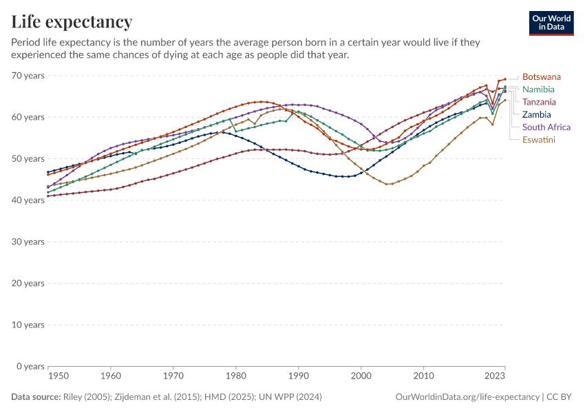 We see a dramatic drop in life expectancy starting around 1990, coinciding with the rise of HIV. In Botswana, life expectancy fell by a decade; in Eswatini, it fell by two decades. Since the early 2000s — as progress has been made in tackling HIV — we see that life expectancy has been rising again.