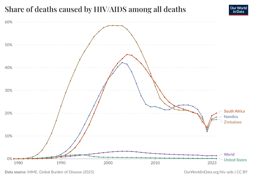 In the visualization, we see the change in the share of deaths from HIV/AIDS over time. From the 1990s through to the early 2000s, it was the cause of more than 1 in 3 deaths in several countries and even more than half of annual deaths in the late 1990s in Zimbabwe.