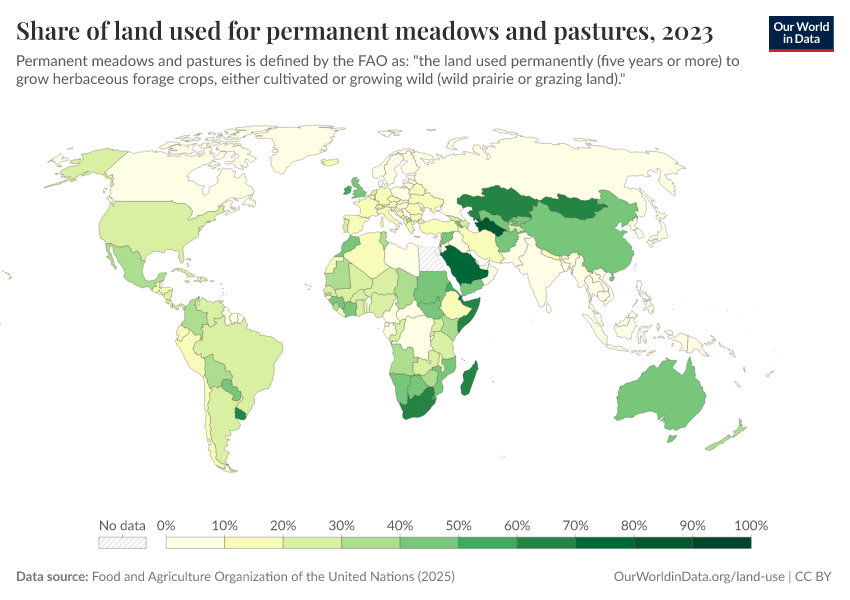 For most countries, the majority of agricultural land is used for livestock rearing in the form of pastureland. In the map here we see the share of permanent meadow and pasture as a percentage of total land area.