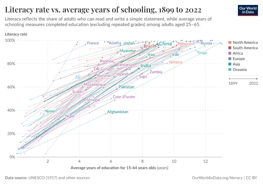 The correlation between educational attainment and literacy holds across countries and over time. The next chart shows this by plotting changes in literacy rates and average years of schooling.