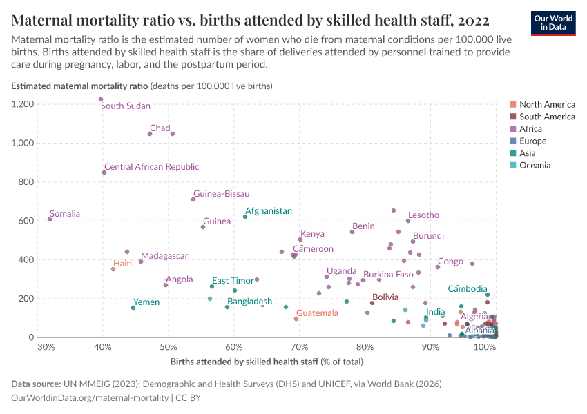 In the second chart, we see the relationship between the maternal mortality rate and the share of births which are attended by skilled health staff.