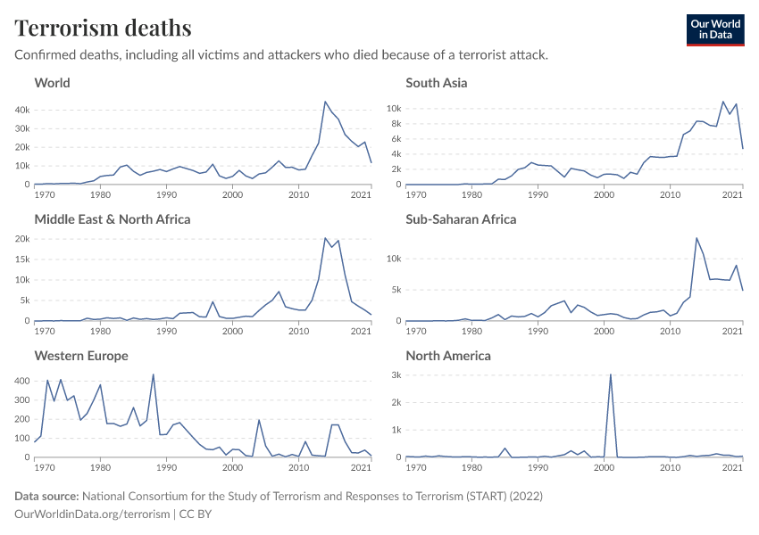 Bastian Herre, Veronika Samborska, Hannah Ritchie, and Max Roser (2023) - “Terrorism” Published online at OurWorldinData.org. Retrieved from: 'https://data-populationgrowth-discre.owid.pages.dev/terrorism' [Online Resource]BibTeX citation