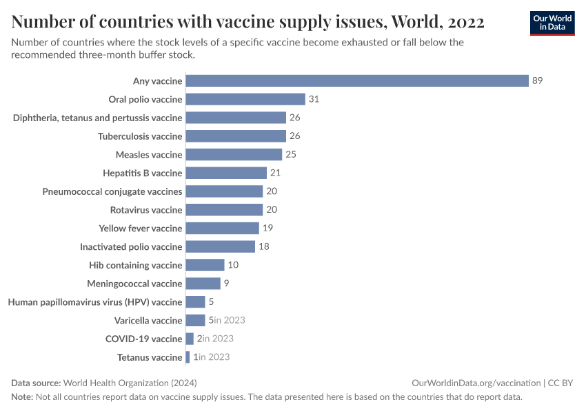 The chart shows that around 90 countries reported shortages of at least one vaccine in 2022. The most common were oral polio, DTP, and BCG vaccines — critical for preventing polio and tuberculosis. Even vaccines for diseases like rotavirus (the most common cause of death from diarrheal disease) and pneumococcal disease faced shortages, though to a lesser extent.
