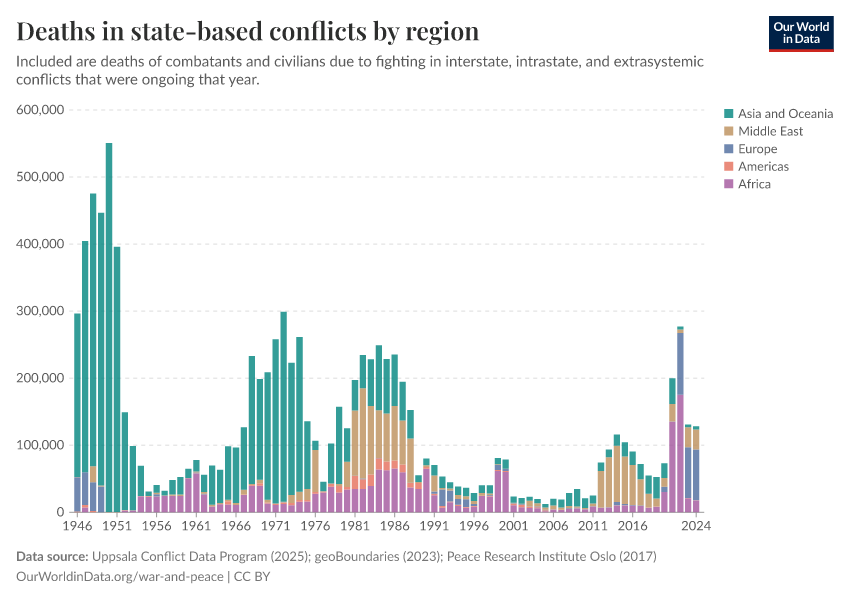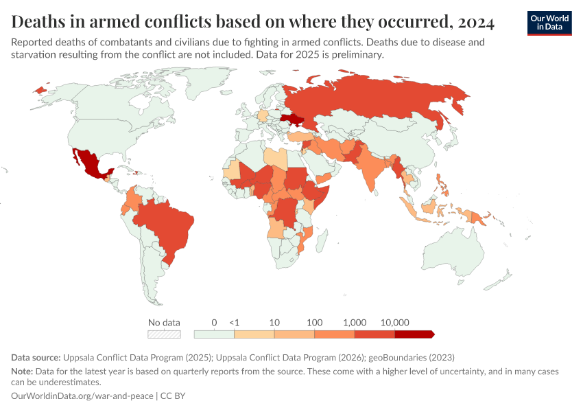 Bastian Herre, Lucas Rodés-Guirao, and Max Roser (2024) - “War and Peace” Published online at OurWorldinData.org. Retrieved from: 'https://data-populationgrowth-discre.owid.pages.dev/war-and-peace' [Online Resource]BibTeX citation